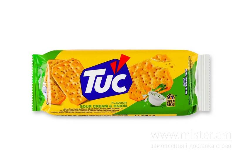 Крекер Tuc Сметана-цибуля - хрусткий крекер із пікантним поєднанням ніжної сметани та запашної цибулі.