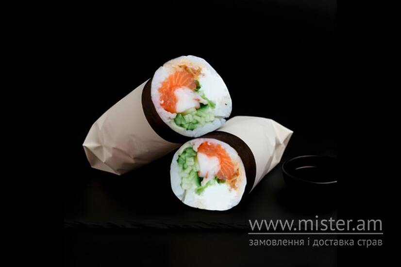 Рис, норі, лосось, креветка, лист салату, огірок, соус спайс, соус унагі, цибуля фрі, сир Філадельфія. Соєвий соус додається безкоштовно.
