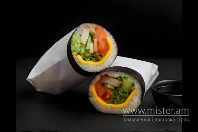 Рис, норі, філе курки, лист салату, огірок, помідор, соус спайс, соус унагі, цибуля фрі. Соєвий соус додається безкоштовно.