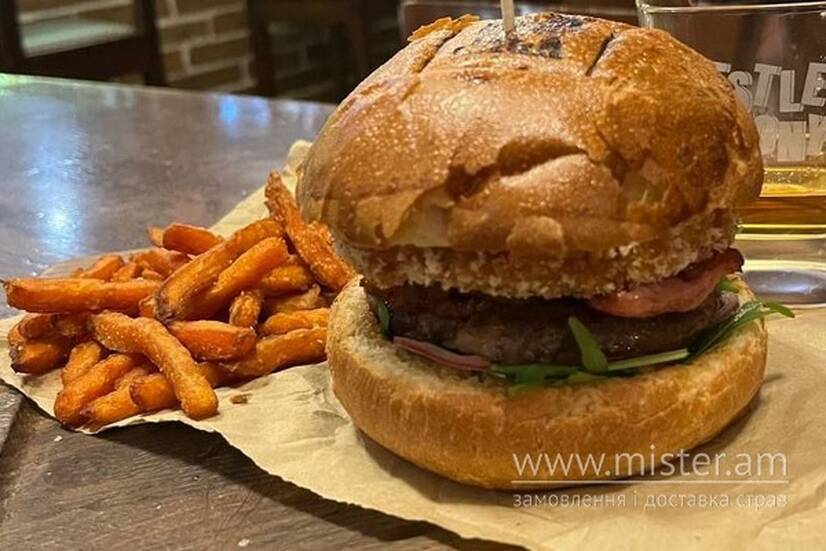 Бургер з телячою котлетою, смаженим беконом, Камамбером фрі, руколою, синьою цибулею, гостро-солодким соусом.