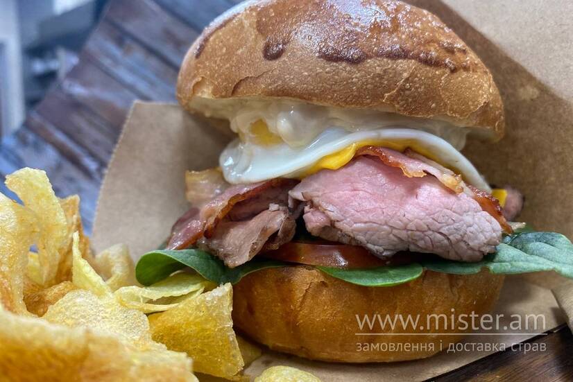 Ростбіф, бекон, яйце, сир чедер, помідор, шпинат, маринований огірок, цибуля фрі, соус Цезар.