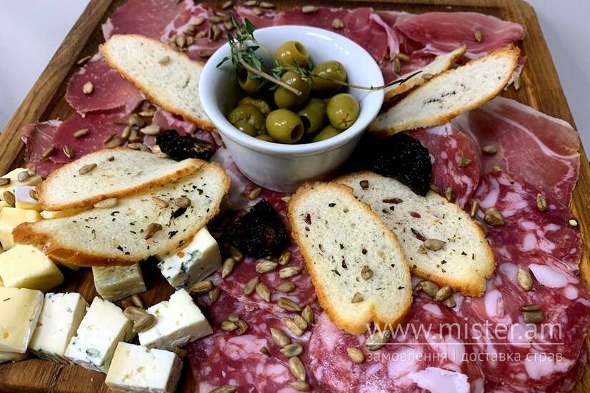 Прошуто, салямі, шинка копа, оливки, сир Брі, сир Лазур.