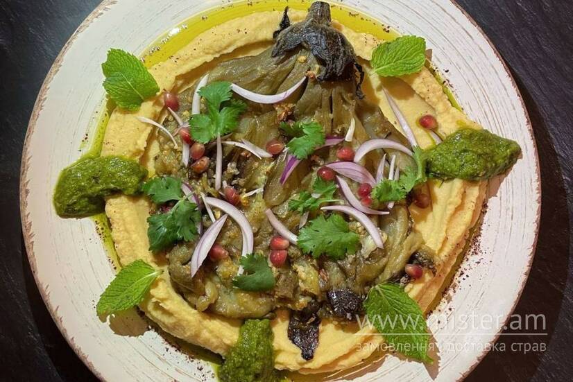 З зернятами гранату та зеленню, подаємо з чіабатою.