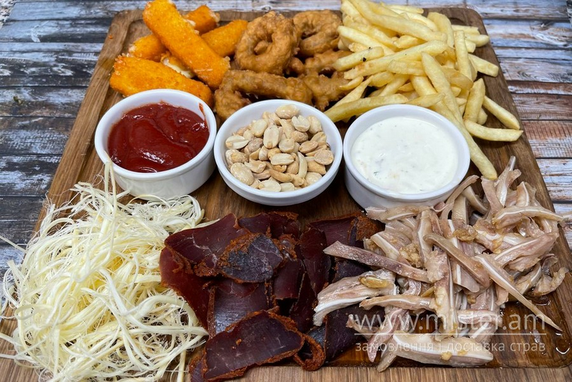 Бастурма, вуха свинні, сирні палички, сир косичка, картопля фрі, цибулеві кільця, арахіс, білий і червоний соус
