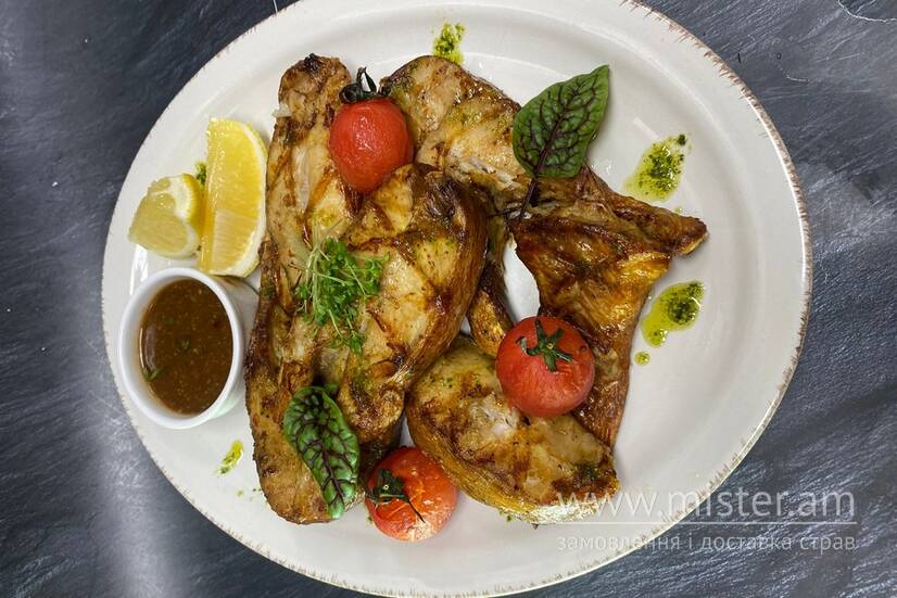 Морський окунь, нарізаний шматочками з томатами гриль, лимоном та східним соусом. Вагова страва (ціна вказана за 100 грам). Вага від 400 до 800 грам.
