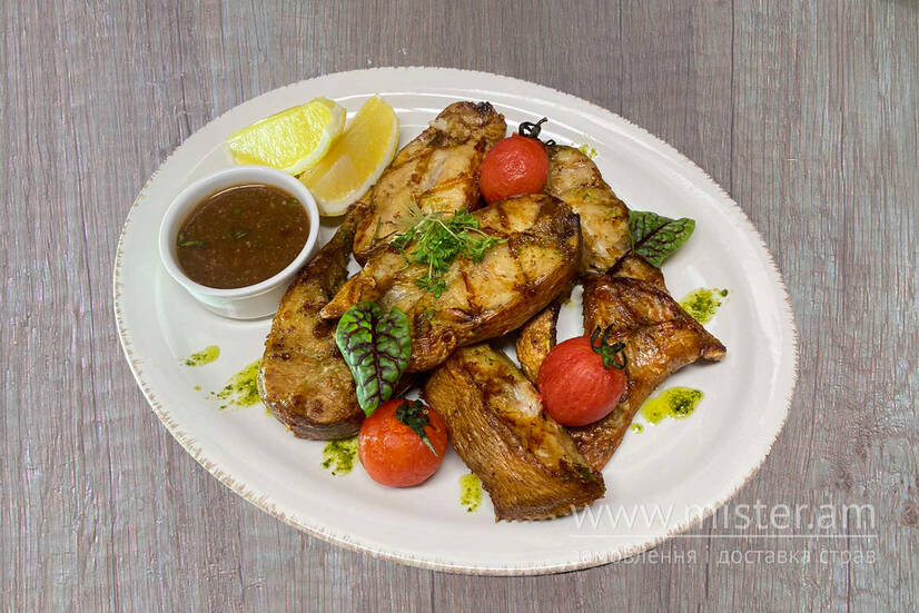 Морський окунь, нарізаний шматочками з томатами гриль, лимоном та східним соусом. Вагова страва. Вага від 400 до 800 грам.