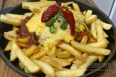 Квебекська страва з картоплі фрі та м`ясним соусом з гострої свинини та сиром Чедер.