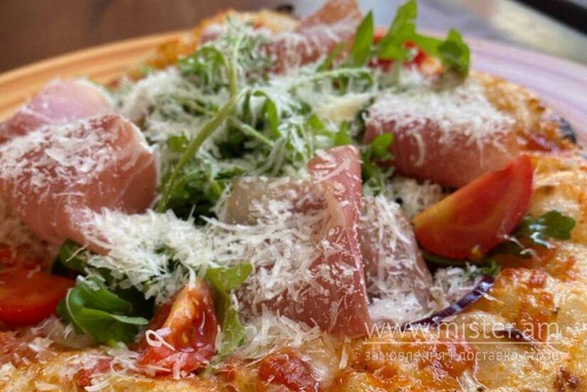 Тісто на заквасці, томатна основа, сир Моцарела, пармська шинка, сир Пармезан, томати, рукола, оливкова олія.