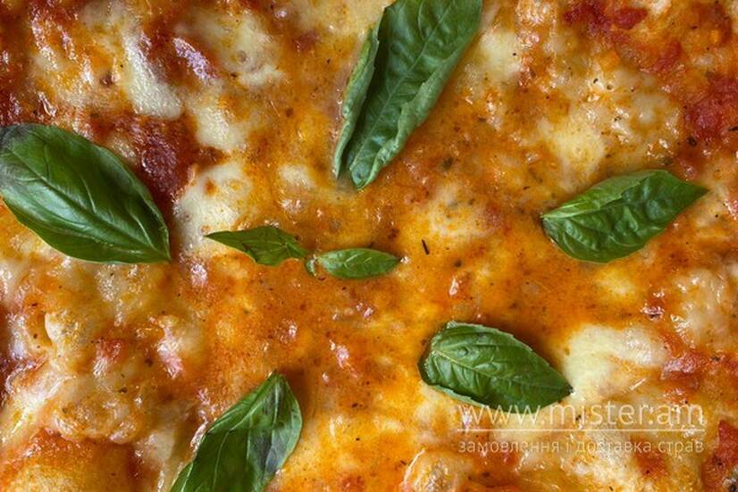 Тісто на заквасці, томатна основа, сир Моцарела, свіжий базилік, оливкова олія.
