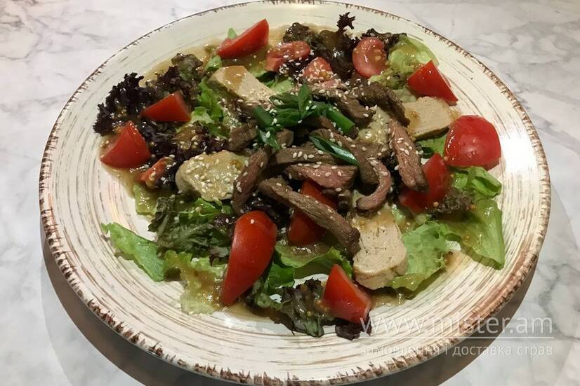 Cмажена телятина,томати,японський омлет,мікс салату,кунжут,гірчичо-бальзамічна заправка,зелена цибуля