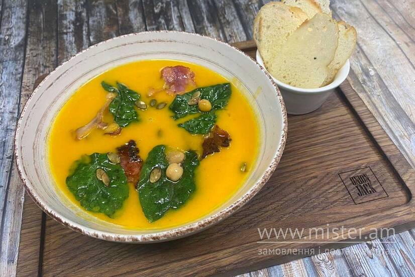 Подається з беконом, пасерованим шпинатом, гарбузовими зернятами та нутом.