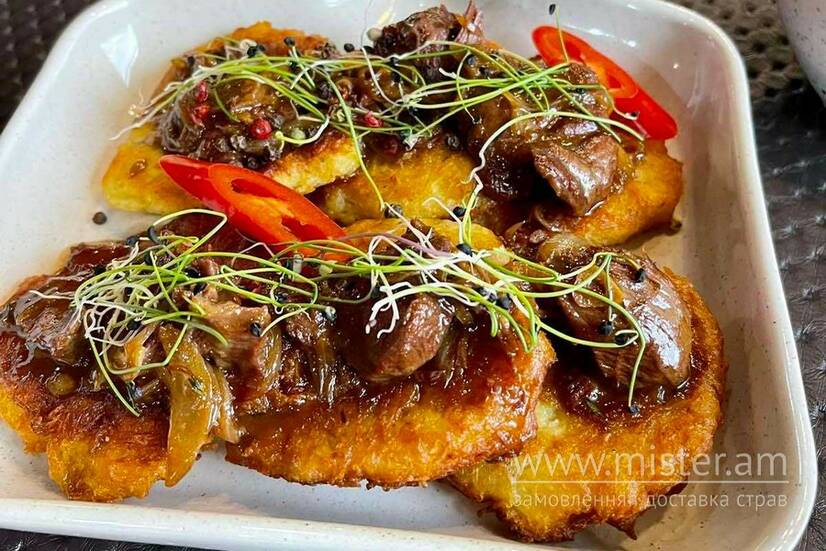 Класичні деруни в поєднанні з томленими у соусі "Теріякі" телячими щічками та сметаною.