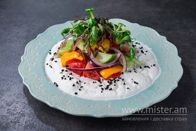 Свіжі огірки, помідори чері, болгарський перець, цибуля синя, мікс-салат. Заправляється оливковою олією.