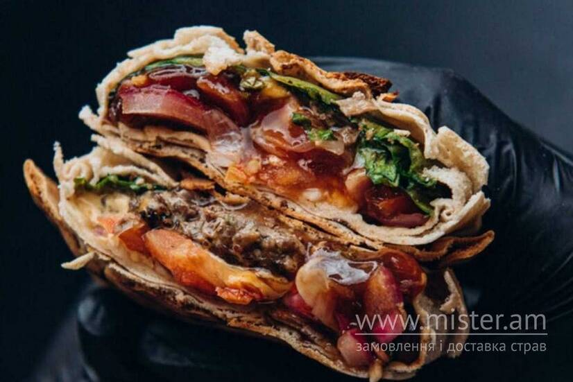Білий лаваш, айсберг, квашені огірочки, карамелізована цибуля з беконом, котлетка яловича, сир чедер, соус барбекю та сирний.