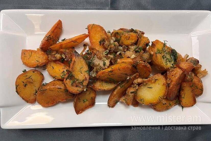 Дольки картоплі запечерні з салом, цибулею, часником.