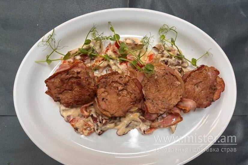 Медальйони зі свинини у беконі на овочевій подушці