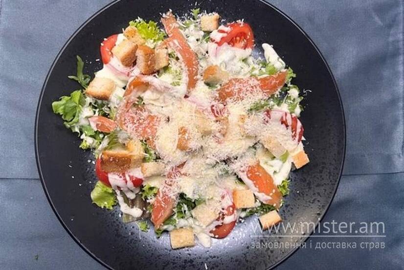 Сьомга слабого посолу, помідор, листя салату, сир пармезан, кунжут, сухарики. Заправка: соус Цезар.