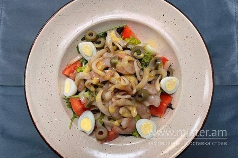 Кальмари, креветки, яйця перепелині, помідор, мікс салату. Заправка: оливкова олія.