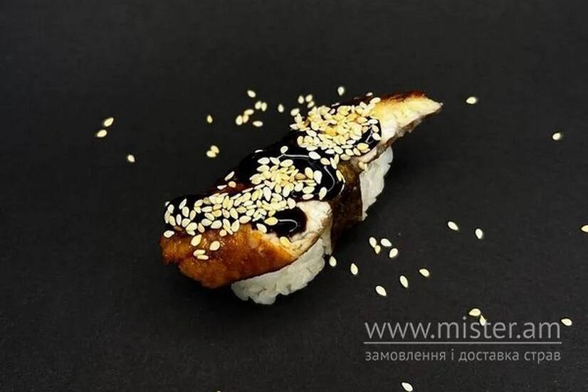 Рис, норі, вугор, соус унагі, білий кунжут.