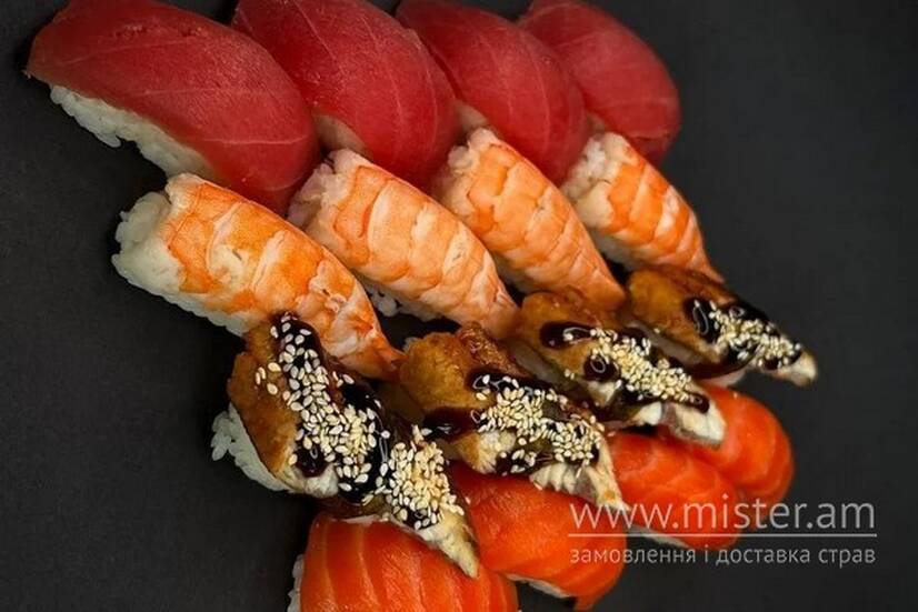 Нігірі з лососем, нігірі з тунцем, нігірі з вугрем, нігірі з креветкою.