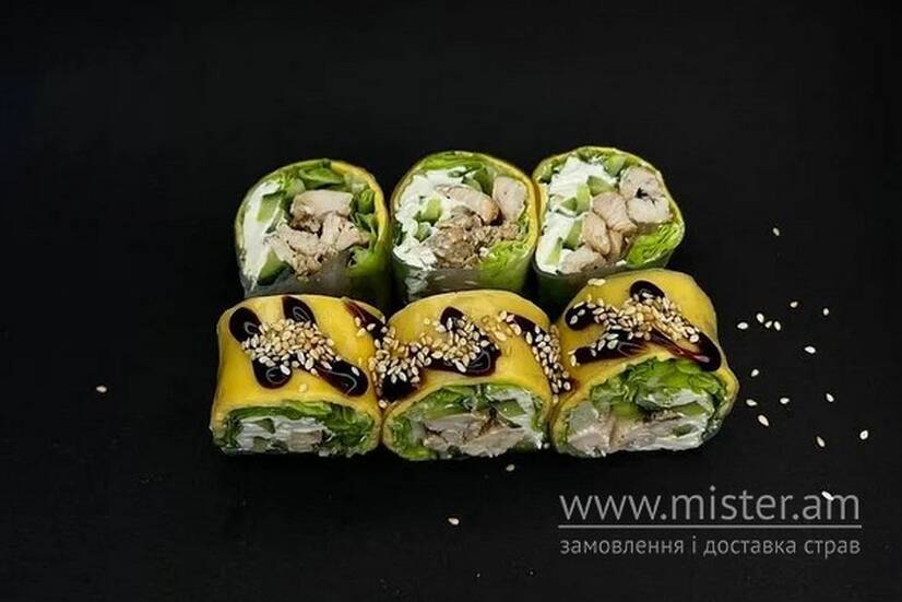 Рисовий папір, сир Філадельфія, тостовий сир, курка, огірок, лист салату, соус унагі, білий кунжут.