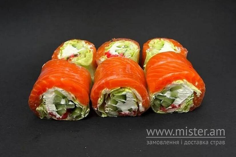 Рисовий папір, сир Філадельфія, огірок, лосось, лист салату, ікра тобіко.