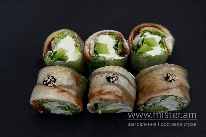 Рисовий папір, авокадо, лист салату, вугорь, сир Філадельфія, соус унагі, білий кунжут.