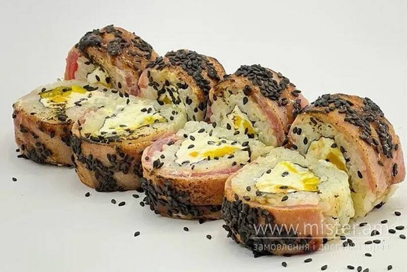 Рис, норі, сир Філадельфія, манго, тунець, соус унагі, кунжут чорний.