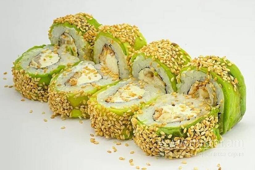 Рис, норі, сир Філадельфія, авокадо, вугор, соус унагі, кунжут білий.