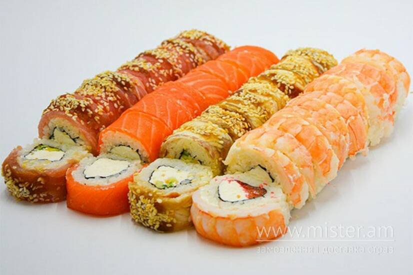 Філадельфія з лососем, Філа з тигровою креветкою, Філадельфія з вугрем, Філадельфія з тунцем.