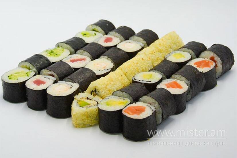 Макі з лососем, макі з тунцем, макі з креветкою, макі з вугрем, макі з огірком, макі з авокадо.