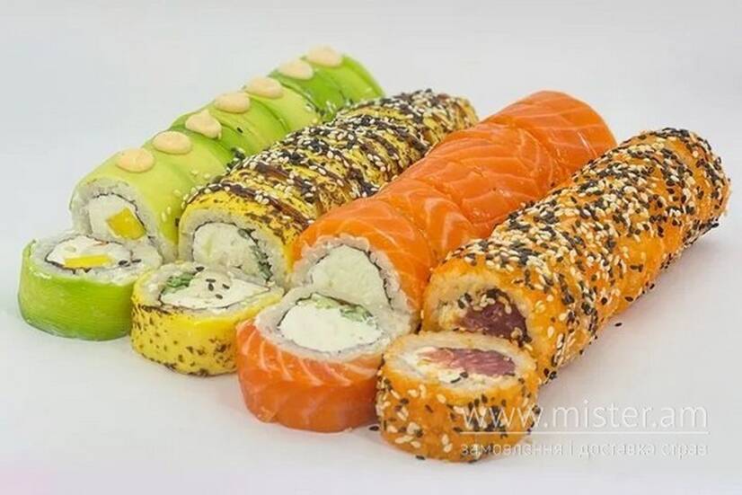 Рол Банзай з креветкою, манго і авокадо; Філадельфія з огірком; рол Токіо зі свіжим тунцем та ікрою тобіко; Чіз рол з запеченою куркою.