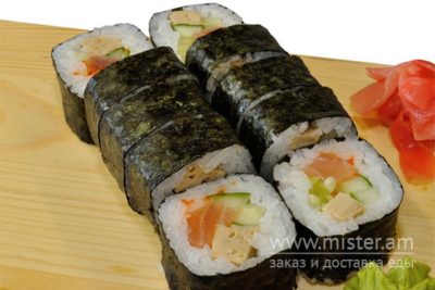 Рис, норі, томаго, ікра тобіко, лосось, огірок.