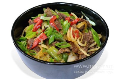 Рамен, яловичина, цибуля, зелена цибуля, спаржа, перець болгарський, гриби.