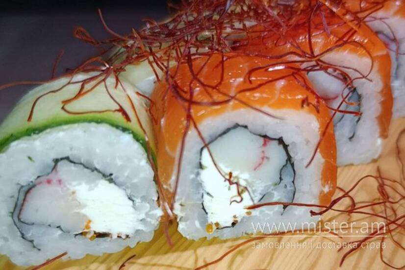 Лосось, огірок, сніговий краб, сир вершковий, нітки чілі.