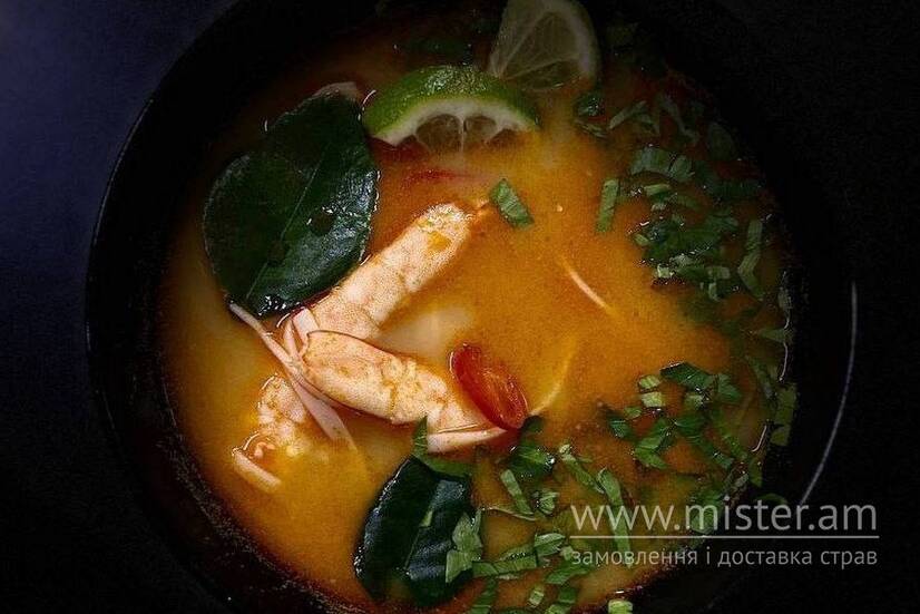 Морепродукти, лапша рисова, лемонграс, Чілі, імбир, кокосове молоко, лайм, петрушка.