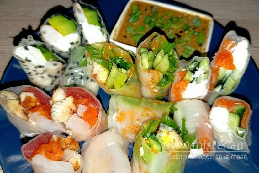 Спрінг рол з лососем, вугрем, креветкою та сашимі.