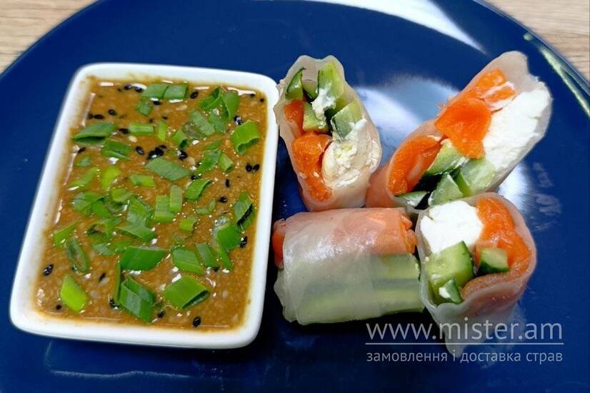 Рисовий папір,лосось, огірок, сир. З соусом "понзу".