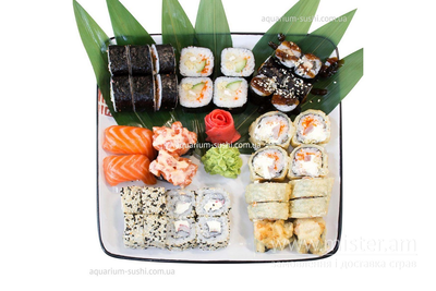 Гарячий рол з окунем та сиром, футомакі з куркою, макі рол з вугрем, рол з сиром та сніговим крабом, спайс мікс 2, суші лосось 2.