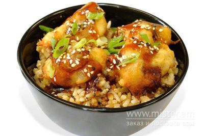 Гриби темпура, рис тяхан, соус теріякі, кунжут.