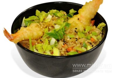 Креветки темпура, рис тяхан, зелена цибуля, кунжут.