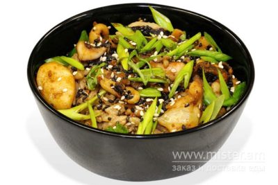 Морський коктейль, рис тяхан, зелена цибуля, кунжут.