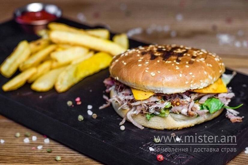 Зі рваною яловичиною зі смокеру, солоним огірком, сиром чедер, трюфельним соусом та соусом BBQ.