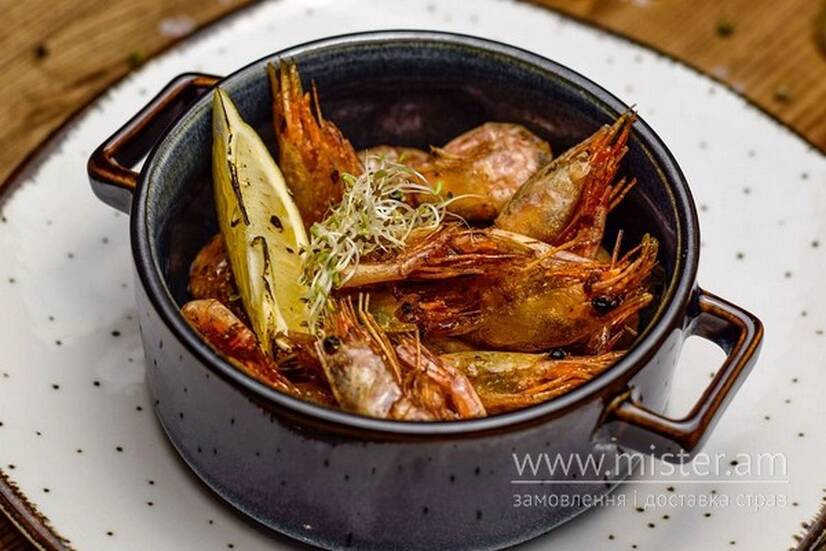 Креветки обсмажені зі спеціями та травами, з додаванням чилі перцю.