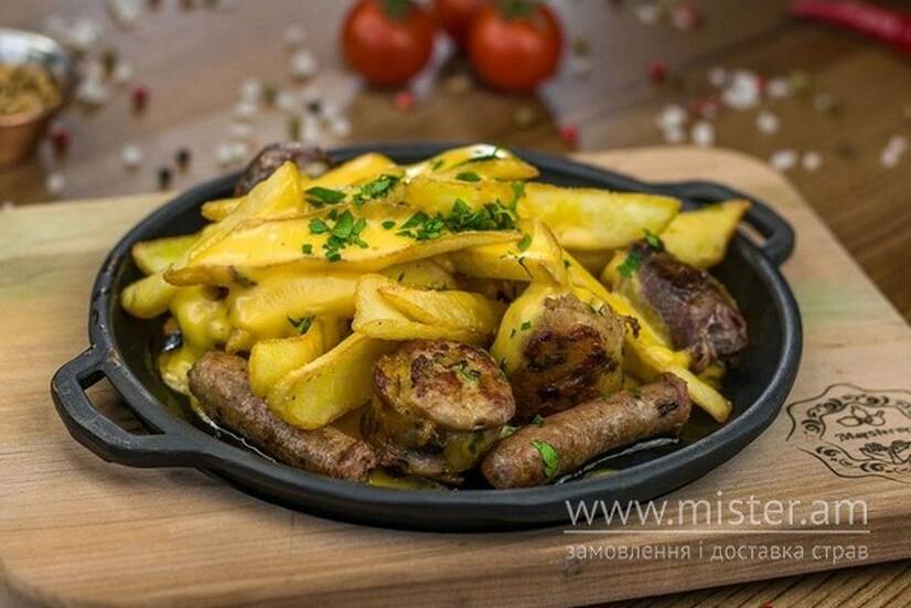 Ковбаси власного виробництва: куряча, зі свинини, з баранини, картопляні діпи, сирний соус, кетчуп.