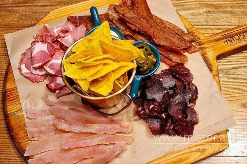 Махан, свинина в`ялена, джерки з курятини, сом холодного копчення, чипси кукурудзяні начос.