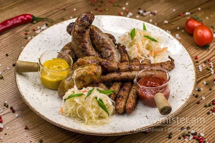 Ковбаси власного виробництва: зі свинини, куряча з сиром чедер, з баранини, квашена капуста, гірчиця, чилі соус.