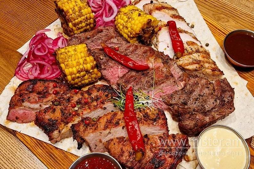 Стейк Рібай, стейк зі свинячого ошийка, стейк з індички,, цибуля маринована , лаваш, соус шашличний, соус сирний, соус BBQ.