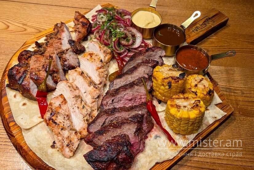 Стейк New York, стейк зі свинячого ошийка, стейк з індички, цибуля маринована, лаваш, соус шашличний, соус сирний, соус BBQ.