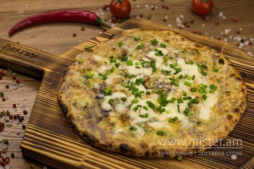 Закритий пиріг з рваною яловичиною зі смокеру, сиром сулугуні, зеленню.